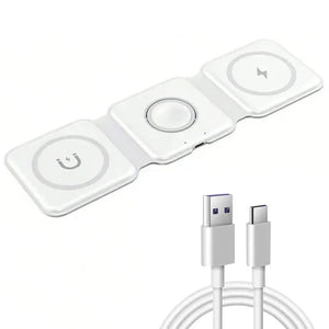 This 3-in-1 foldable wireless charger features fast 15W magnetic charging for your phone, earbuds, and smartwatch. Slim, compact, and travel-friendly—perfect for charging multiple devices with ease.