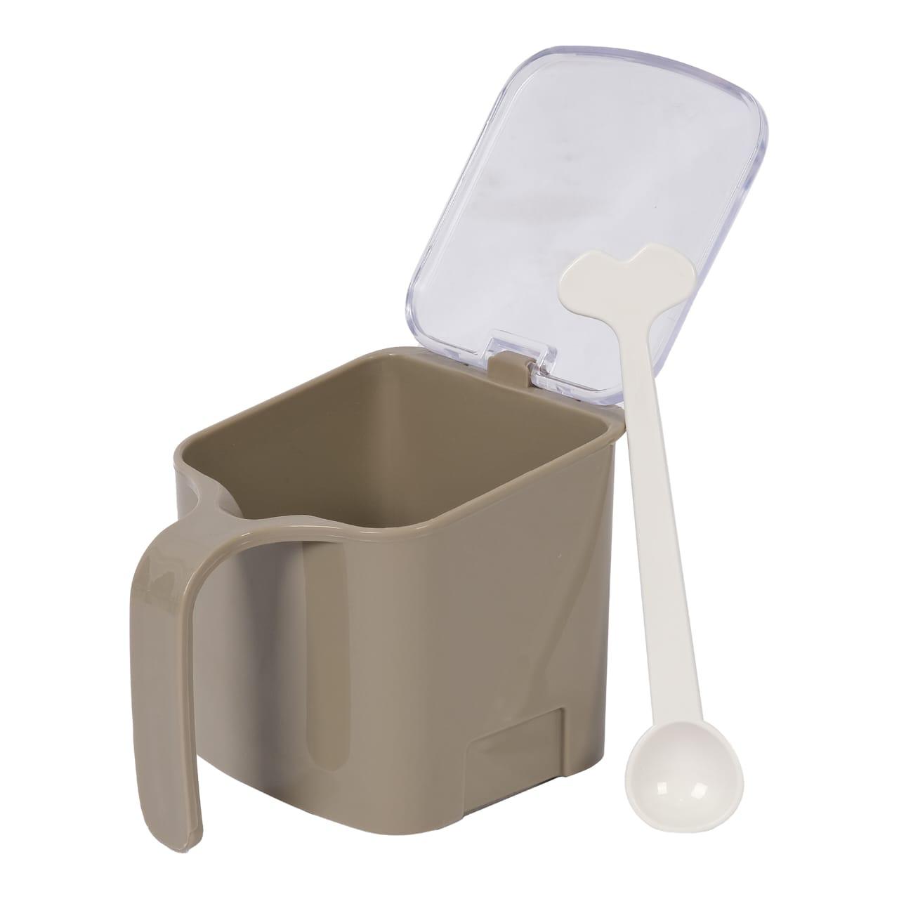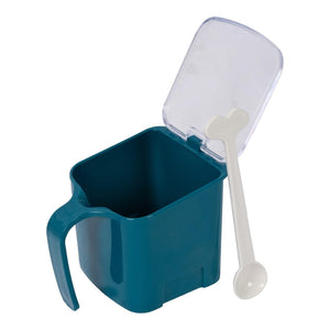 - Convenient handle, cover lid, and spoon for easy access